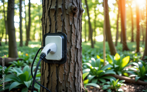 A futuristic concept of an electric vehicle charging port seamlessly integrated into the bark of a tree, symbolizing sustainable energy and harmony with nature.