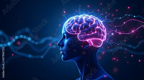 A futuristic concept of artificial intelligence and neuroscience, showing a human profile with a luminous brain and glowing neural network data streams.