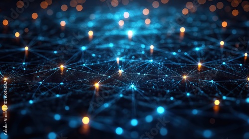A futuristic connectivity concept with blue and green network lines forming a technical grid, representing a high-tech environment.