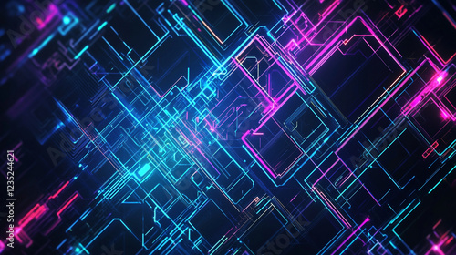 A futuristic cyberpunk background with glowing neon lines in electric blues, purples, and pinks arranged in a tech-inspired grid.