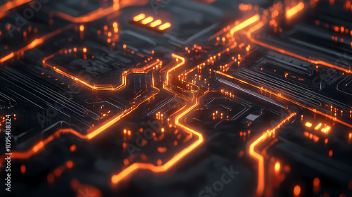 A futuristic, dark textured background with glowing orange lines, ideal for technology-themed designs. Futuristic Neon Circuit. Illustration