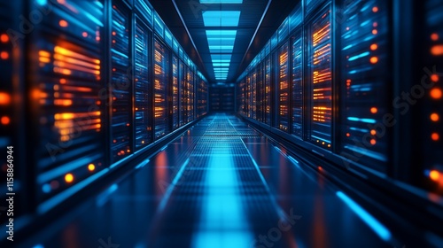 A futuristic data center corridor lined with illuminated server racks, showcasing a vibrant blue and orange color scheme.