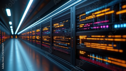 A futuristic data center corridor lined with servers displaying vibrant orange and blue lights, showcasing digital information and technology.