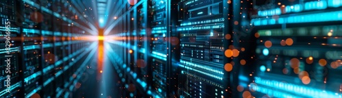 A futuristic data center with glowing servers and digital lights showcasing advanced technology and data storage solutions.
