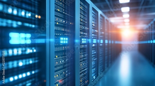 A futuristic data center with rows of illuminated server racks, showcasing advanced technology and a vibrant atmosphere.