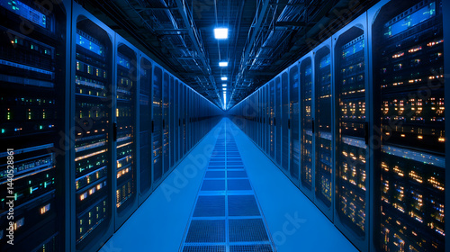 A futuristic design illuminates the empty corridor of the computer network server room in the data center's underground architecture