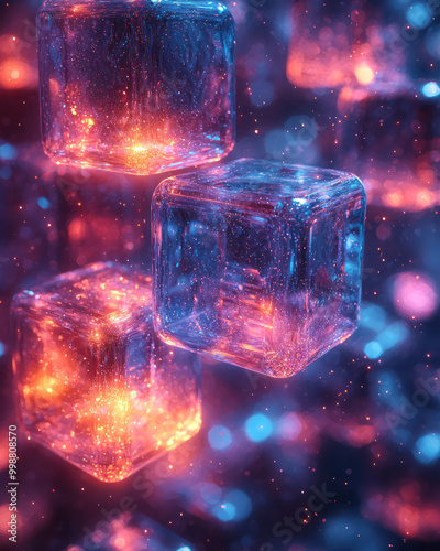 A futuristic design of floating cubes arranged in a 3D space, softly glowing with blue and purple tones,
