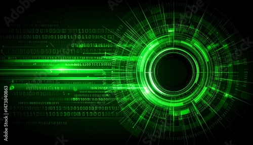 a futuristic digital abstract technology graphic design. The image features a glowing green circular design with binary code on a black background