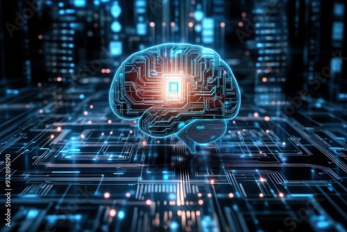 A futuristic digital brain with circuitry, symbolizing advanced technology and artificial intelligence in a glowing virtual environment.