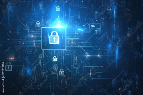 A futuristic digital circuit board with glowing blue padlock icons, symbolizing cybersecurity and data protection. Perfect for technology presentations, online security themes, and IT-related campaign