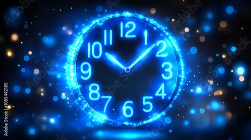 A futuristic digital clock light effect. A glowing silhouette of a clock representing time. Background laser blue neon clock vector illustration