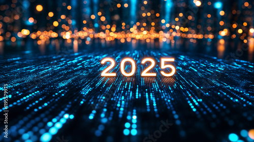 A futuristic digital concept showcasing the year "2025" in glowing blue neon lights on a circuit board-like surface. The image features vibrant orange and blue light patterns symbolizing technology