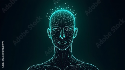 A futuristic digital human head made of glowing plexus networks. A concept for artificial intelligence, virtual identity, facial recognition, or human consciousness.