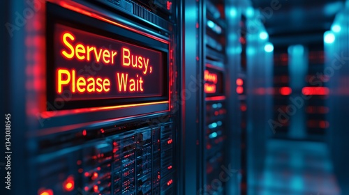 A futuristic digital infrastructure setup, where an LED screen on a server rack warns: "Server Busy, Please Wait"