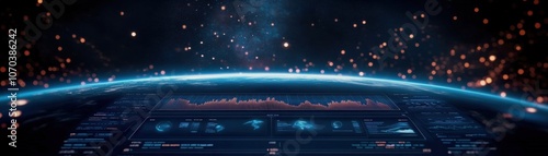 A futuristic digital interface illustrates a view of Earth from space, surrounded by stars and cosmic elements, emphasizing technology and exploration.