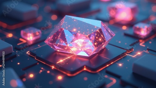A futuristic digital interface with crystalline facets and soft vector glows amidst ambient lighting.