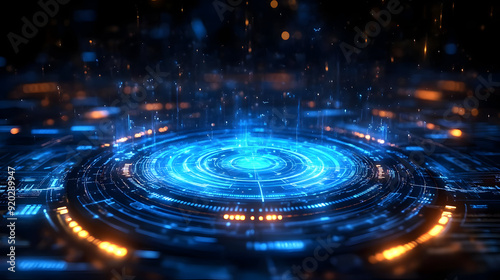 A futuristic digital interface with glowing blue and orange elements, suggesting technology and data.