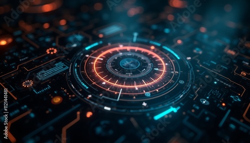 A futuristic digital interface with various holographic displays, glowing lines, and a central circular element resembling a technological device or mechanism. The background has a dark, moody atmosph