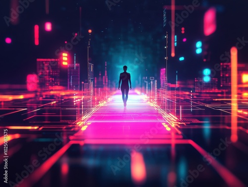 A futuristic digital landscape featuring a lone figure amidst vibrant neon lights and geometric patterns, evoking a sense of exploration.