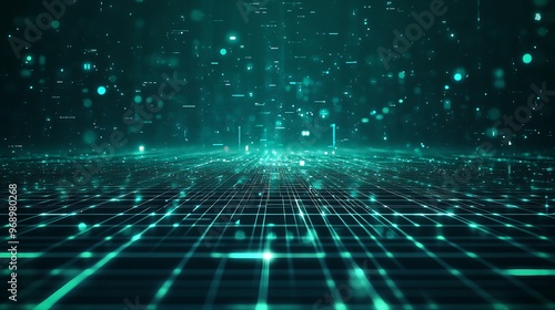 A futuristic digital landscape featuring glowing particles and a grid pattern, illustrating technology and innovation.