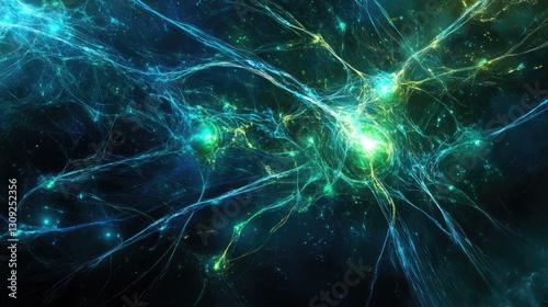 A futuristic digital network concept with glowing blue and green nodes connected by flowing energy lines.