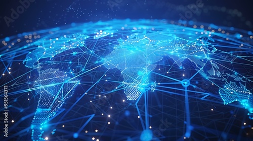 A futuristic digital network with a blue-toned world map at the center, showcasing global connectivity through bright, glowing lines and dots, set on a sleek cyber background