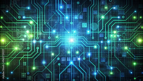 A futuristic digital pattern showcasing stylized binary code and circuitry, rendered in bright green and blue hues, on a dark gray background with subtle texture and noise.