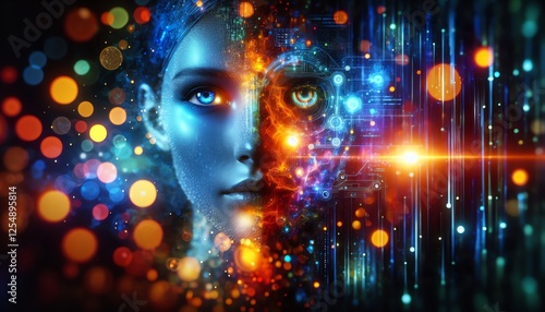 A futuristic digital portrait of a young woman’s face merged with technological elements