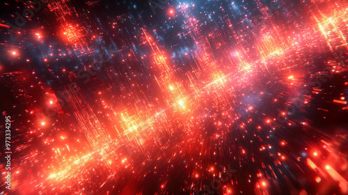 A futuristic digital scene with glowing red light streaks and particles, creating a dynamic and abstract background