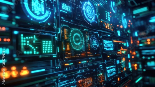A futuristic display of glowing blue and neon green HUD interface elements, showcasing digital symbols and data visualizations in high-tech design