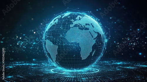 A futuristic Earth icon with a wireframe globe and digital grid lines forming the continents