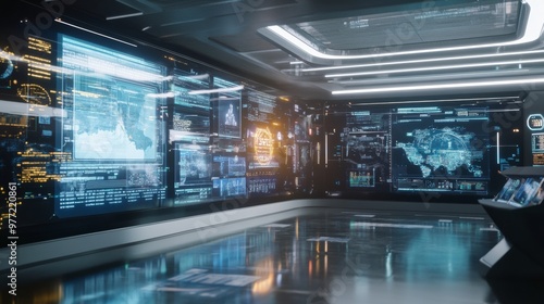A futuristic election room with transparent screens showing voter turnout holograms of candidates