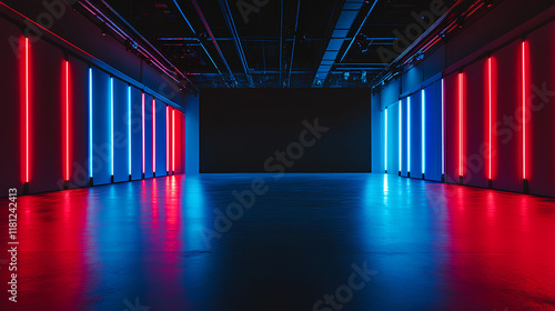 A futuristic, empty dark hall with red and blue LED lights serves as a modern neon room background, evoking concept of a studio, game, show, building, industry, and future