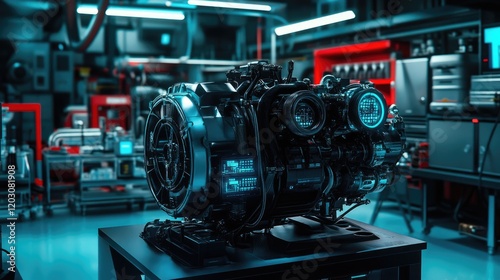A futuristic engine concept with holographic displays, set in a sci-fi laboratory environment.