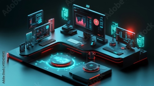 A futuristic gaming setup featuring glowing monitors, sleek design, and high-tech elements, creating an immersive digital environment.
