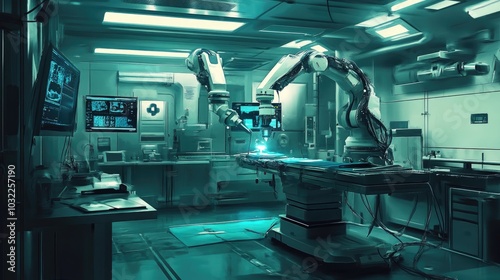 A futuristic healthcare environment with robotic arms performing surgery, highlighting the incredible advancements in medical technology
