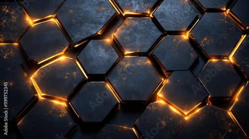 A futuristic hexagonal pattern with glowing edges, merging dark textures and light, creating a dynamic visual effect.