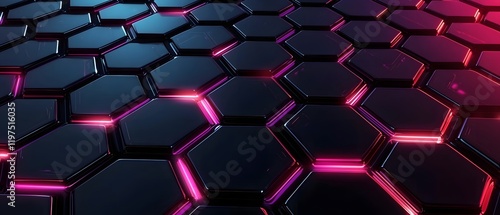 A futuristic hexagonal pattern with glowing lines and smooth black surfaces in dark purple and red.