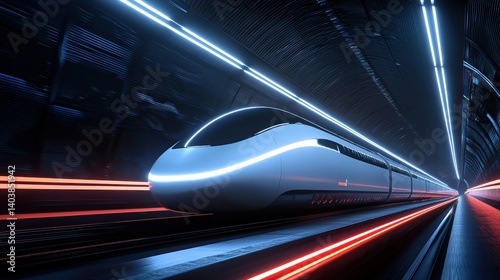 A futuristic high speed train speeding through a dark tunnel