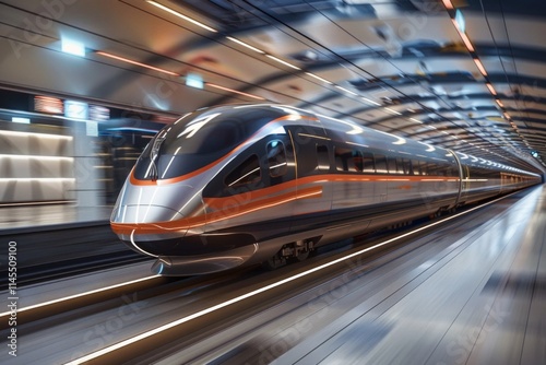A futuristic high-speed train speeds through a tunnel with a bright orange stripe. AI generative. .