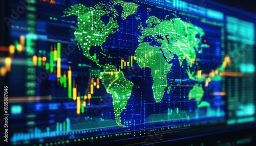 A futuristic holographic display of global stock exchanges, with graphs, and data points showcasing worldwide financial connectivity and the stock market’s digital future