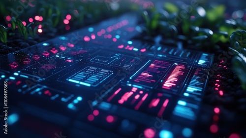 A futuristic holographic display with data and charts emerges from the earth in a field of plants.