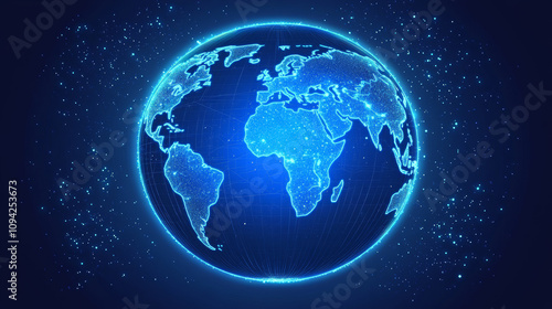 A futuristic, holographic globe shows global connections. The world map is a hexagonal pattern, perfect for digital designs.