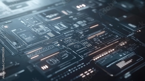 A futuristic holographic interface with digital touch elements on a dark blue background.