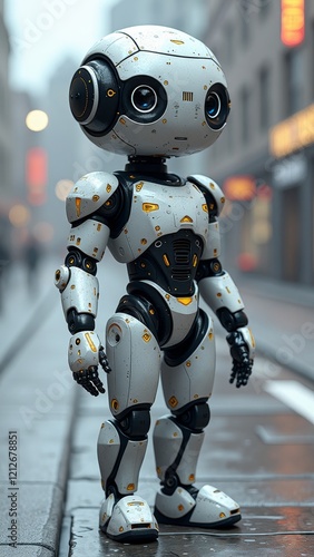 A futuristic, humanoid robot with a sleek silver body and glowing blue eyes