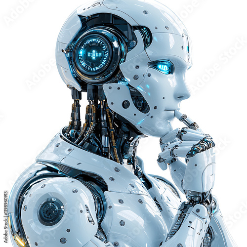 A futuristic humanoid robot with blue glowing eyes, deep in thought.