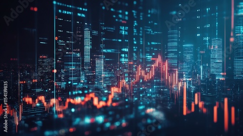 A futuristic image of a city skyline overlaid with digital graphs and stock market data.