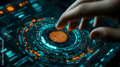 A futuristic image showcasing a hand interacting with a digital interface. Ideal for technology websites or presentations. Use for futuristic concepts or design.