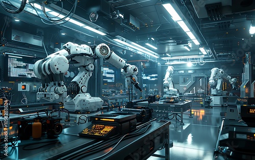 A futuristic industrial setting featuring advanced robotic arms working in unison, illuminated by artificial lights.