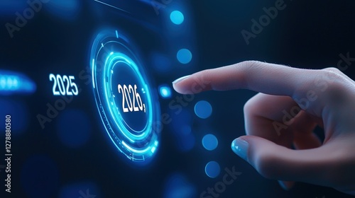 A futuristic interface displays the year 2025, with a hand poised to interact, emphasizing technology and digital engagement.